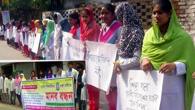 ঘন্টাব্যাপী ওই মানববন্ধন কর্মসূচিতে বাগেরহাট মেডিকেল অ্যাসিসটেন্ট ট্রেনিং স্কুলের (ম্যাটস্) কয়েক’শ শিক্ষার্থী অংশ নেয়। পরে তারা বাগেরহাটের জেলা প্রশাসকের মাধ্যমে তাদের দাবির স্বপক্ষে প্রধানমন্ত্রীকে স্মারকলিপি প্রদান করেন।