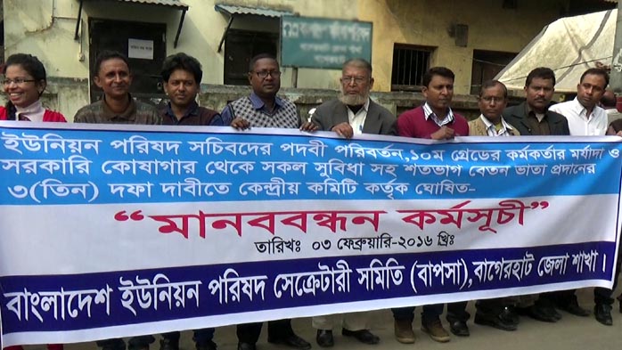 কেন্দ্রীয় কর্মসুচীর অংশ হিসাবে বাংলাদেশ ইউনিয়ন পরিষদ সেক্রেটারী সমিতি’র (বাপসা) বাগেরহাট শাখা বুধবার (৩ ফেব্রুয়ারি) দুপুরে শহরের প্রেসক্লাবের সামনে এ মানববন্ধনেরর আয়োজন করে।