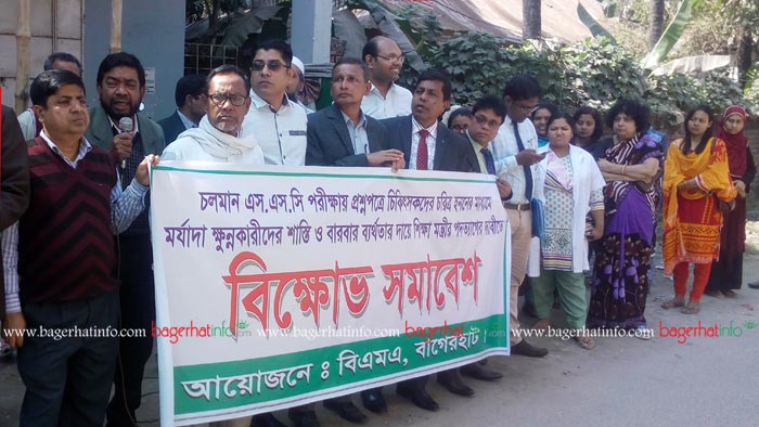 চলমান এসএসসি পরীক্ষার প্রশ্নপত্রে চিকিৎসকদের চরিত্র হনন ও ব্যর্থতার দায়ে শিক্ষামন্ত্রীর পদত্যাগ দাবিতে বাগেরহাটে চিকিৎসকরা সমাবেশ করেছে।