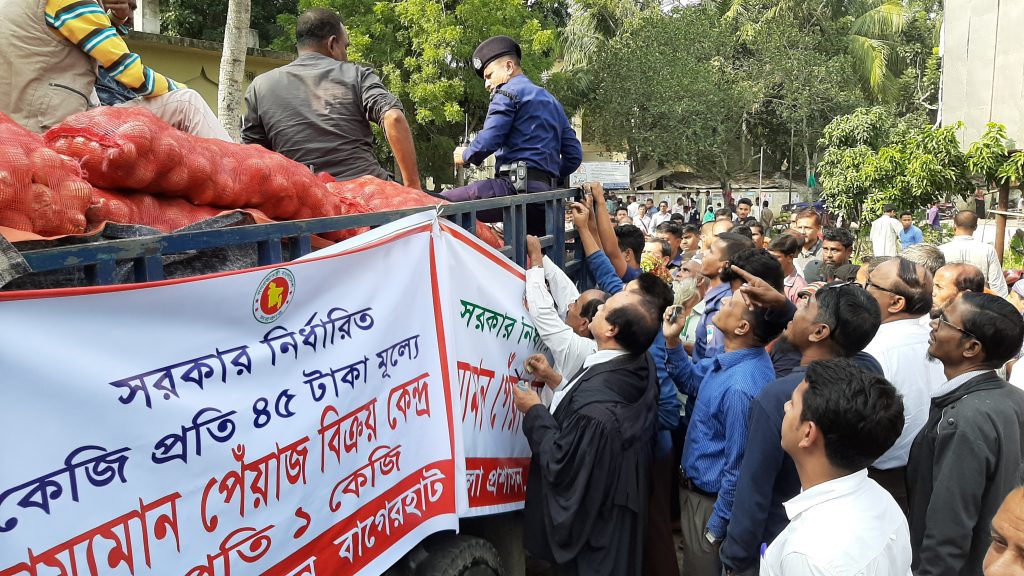 বাজার নিয়ন্ত্রণে সোমবার (২ ডিসেম্বর) দুপুরে বাগেরহাটের জেলা প্রশাসকের কার্যালয় চত্বরে ন্যায্যমূল্যে পেঁয়াজ বিক্রি শুরু হয়। ৪৫ টাকা কেজি দরে পেঁয়াজ কিনতে টিসিবির ভ্রাম্যমাণ দোকানে ভিড় করেন নানা বয়সী নারী-পুরুষ।