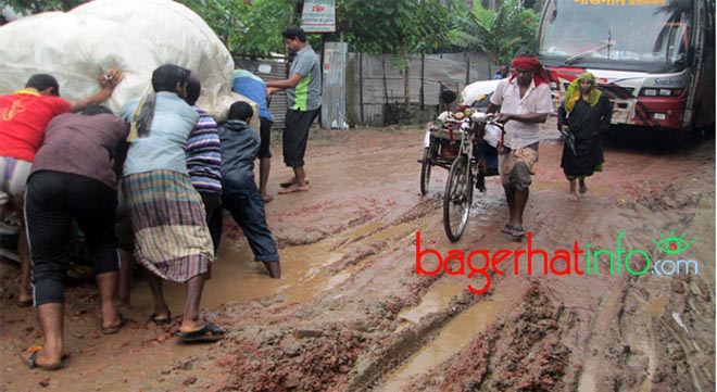 খানাখন্দে ভরা মোরেলগঞ্জ রুটে বাস চলাচল বন্ধ