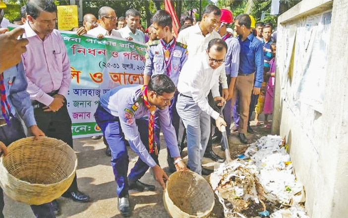 শোভাযাত্রা শেষে বাগেরহাটের জেলা প্রশাসক মো. মামুনুর রশীদ নিজ কার্যালয় প্রাঙ্গণে পরিচ্ছন্নতা অভিযানে অংশ নেন। ছবি: বাগেরহাট ইনফো ডটকম।